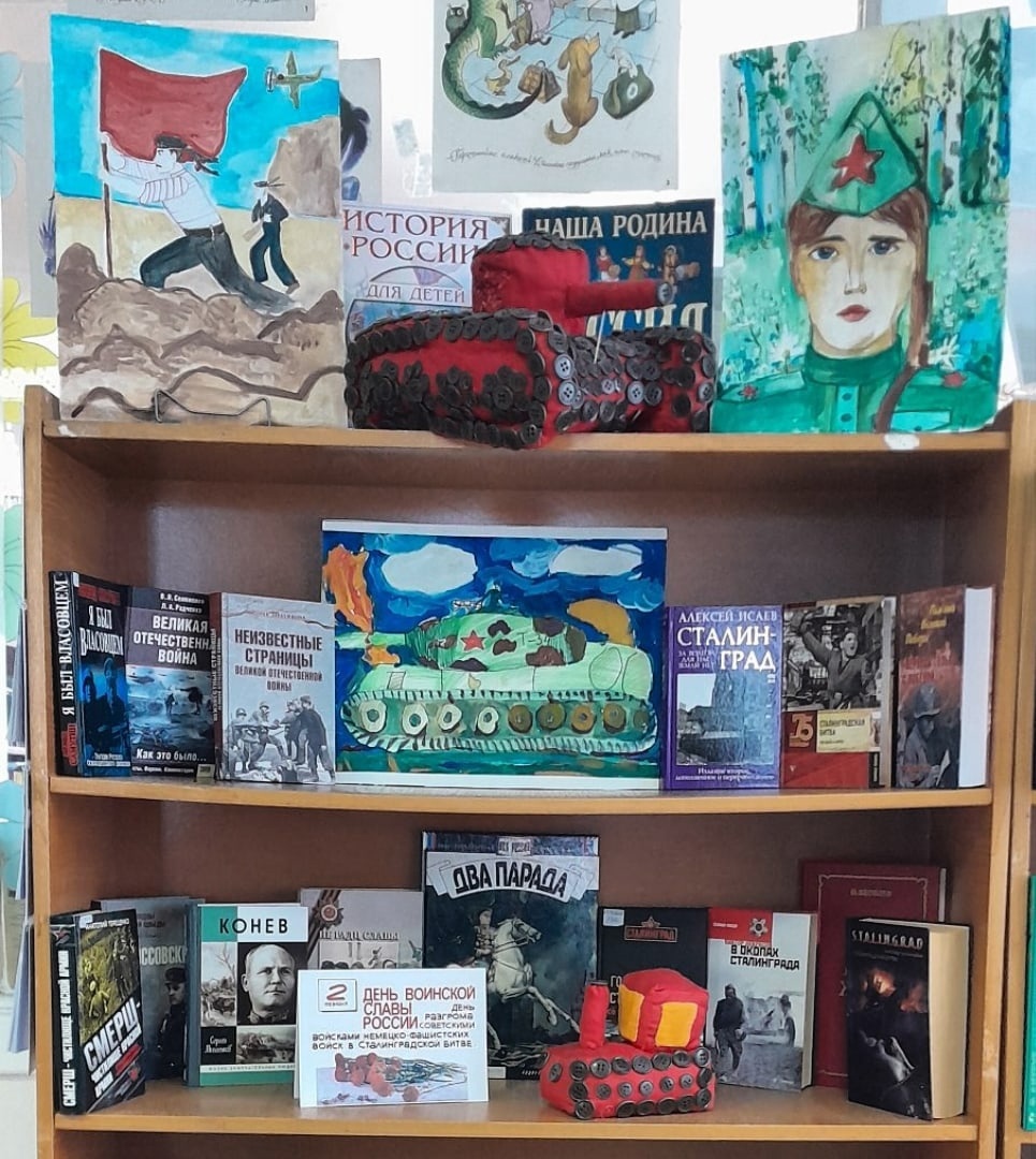 В нашей библиотеке открыта тематическая выставка. На которой представлены книги о Сталинградской битве, и работы учащихся Копорской ДШИ ( отделение ДПИ, руководители : Кузнецова Е.А., Кабанова Ж.Н.)
