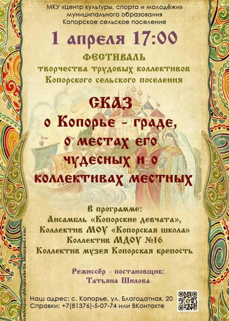 Только 1 апреля и только у нас, в Центре культуры, ФЕСТИВАЛЬ творчества трудовых коллективов села КОПОРЬЕ.