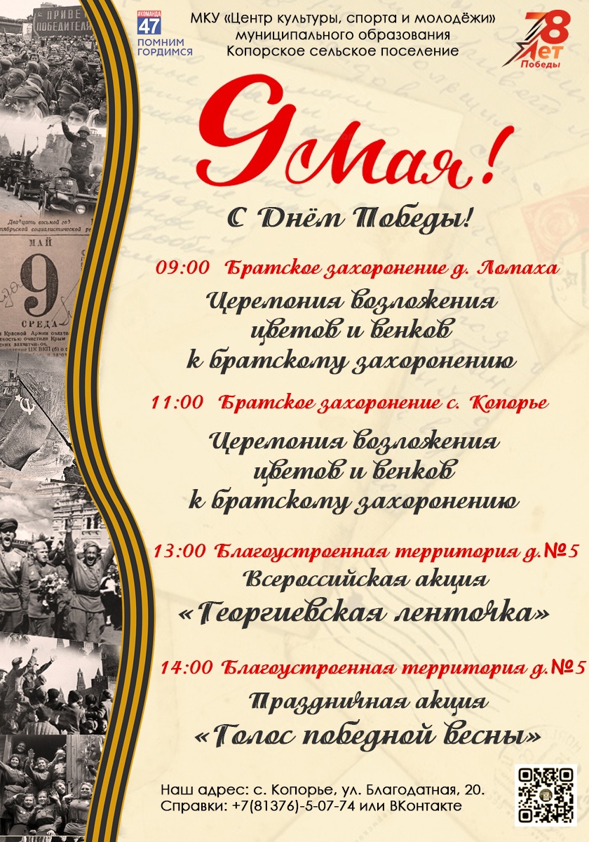 Приглашаем вас принять участие в мероприятиях, посвящённых празднованию 78-й годовщины Победы в Великой Отечественной войне. Опубликовано 05.05.2023 в рубрике Афиша, Новости Уважаемые жители и гости Копорского сельского поселения! Приглашаем вас принять участие в мероприятиях, посвящённых празднованию 78-й годовщины Победы в Великой Отечественной войне.