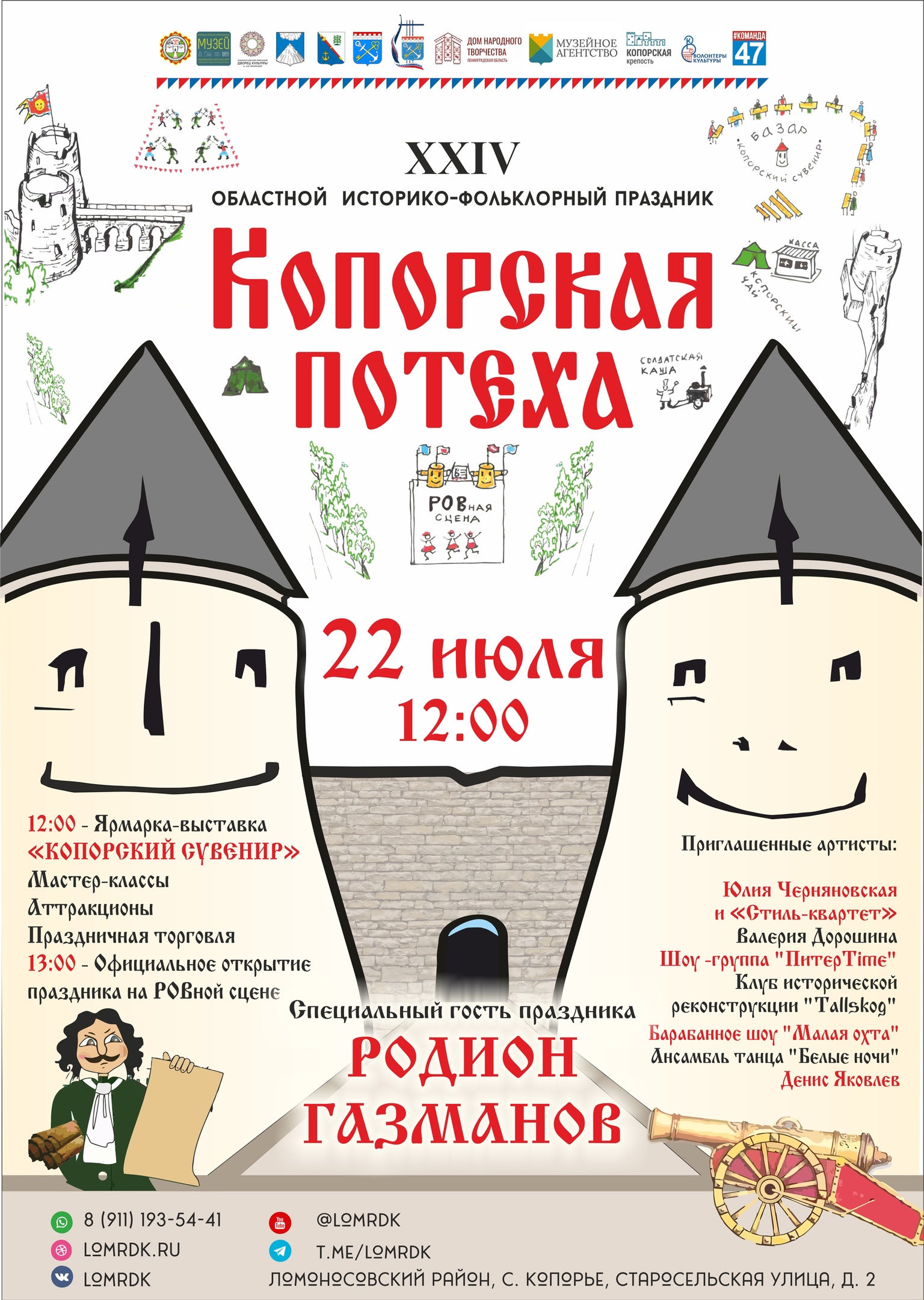 Мы обещаем, что гостей праздника ждёт насыщенная творческая программа, посвящённая 786-летию самой Копорской крепости, 96-летию со дня образования Ленинградской области и Ломоносовского района и 80-летию прорыва блокады Ленинграда.