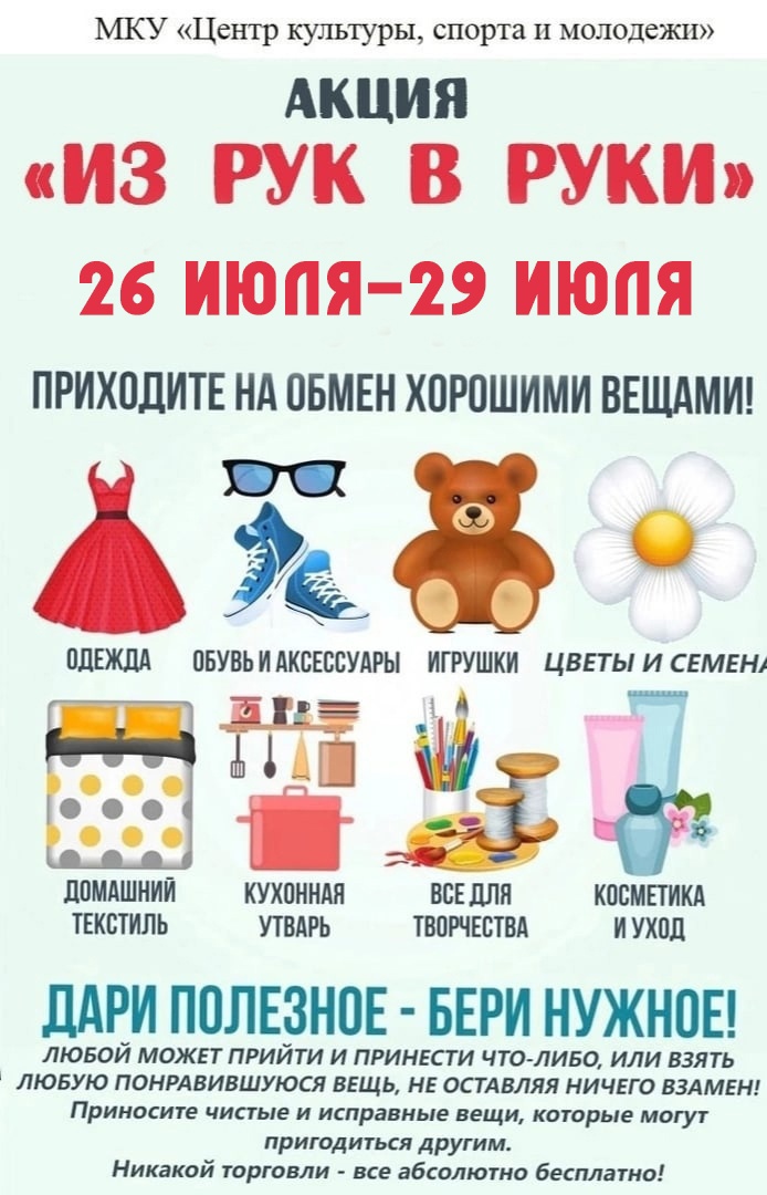В «Центре культуры» организована Акция «Из рук в руки», которая будет проходить с 26 июля по 29 июля включительно.