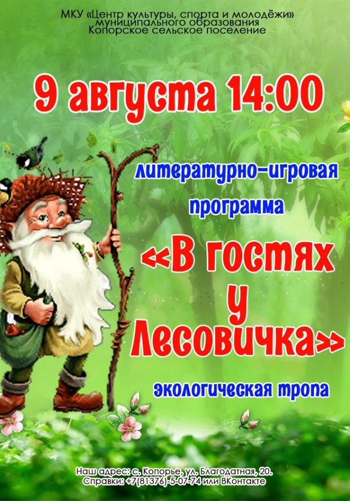 9 августа в 14:00 приглашаем всех юных гостей и жителей нашего села на литературно-игровую программу » В гостях у лесовичка». Опубликовано 04.08.2023 в рубрике Афиша, Новости «Когда ты идёшь по тропинке лесной, вопросы тебя обгоняют гурьбой!» 9 августа в 14:00 приглашаем всех юных гостей и жителей нашего села на литературно-игровую программу » В гостях у лесовичка».
