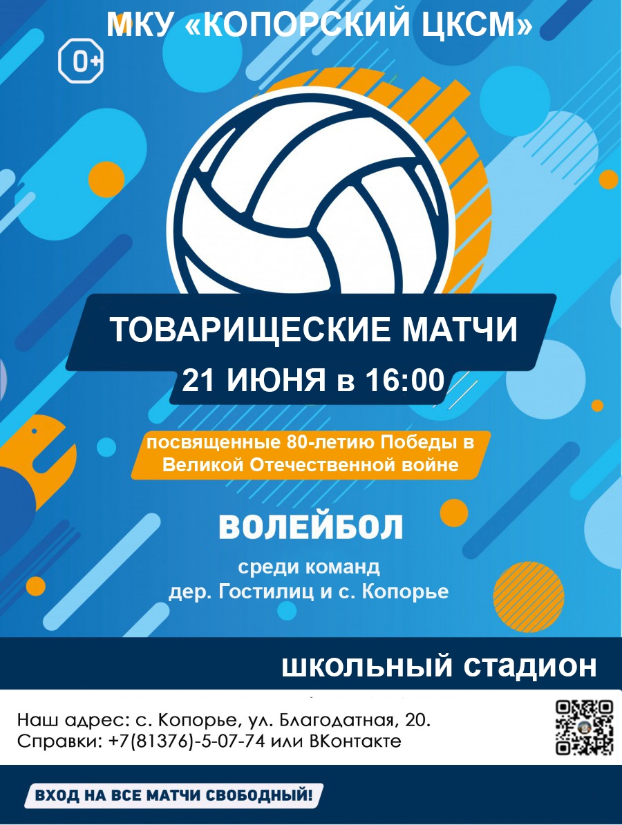 Приглашаем жителей Копорья принять участие в товарищеских матчах по волейболу Опубликовано 19.06.2025 в рубрике Афиша, Новости Приглашаем жителей Копорья принять участие в товарищеских матчах по волейболу среди юношей и девушек. 🗓 21 июня 2025 года 🕓 в 16:00 📍 Место проведения: с. Копорье, школьный стадион