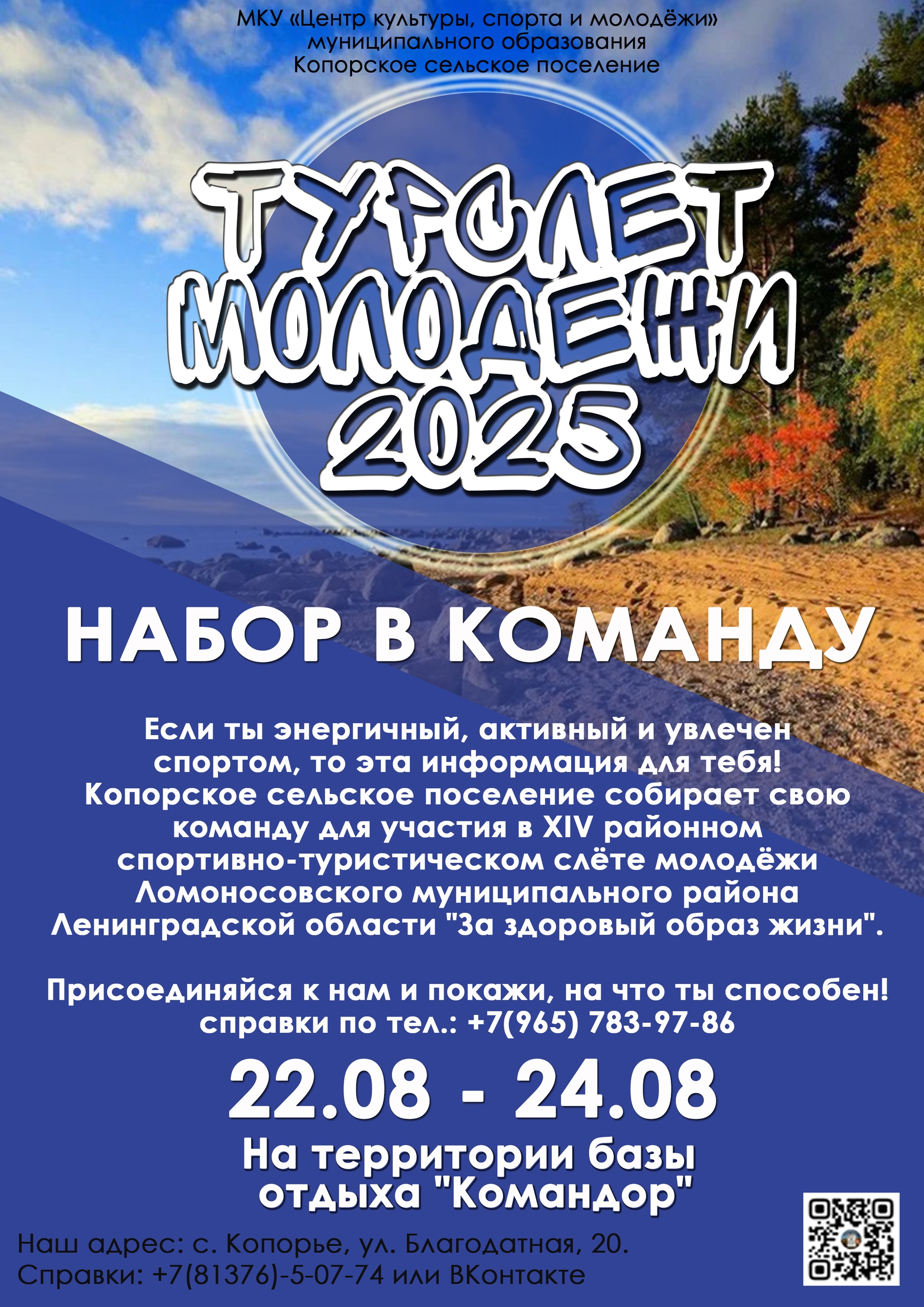📢Если ты энергичный, активный и увлечен спортом, то эта информация для тебя! Копорское сельское поселение собирает свою команду для участия в XIV районном спортивно-туристическом слёте молодёжи Ломоносовского муниципального района Ленинградской области «За здоровый образ жизни». Присоединяйся к нам и покажи, на что ты способен!