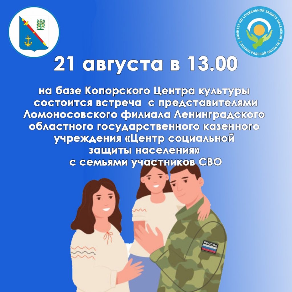 21 Августа в 13:00 в Копорском центре культуры состоится встреча с представителями «Центра социальной защиты населения» Опубликовано 18.08.2025 в рубрике Афиша, Новости