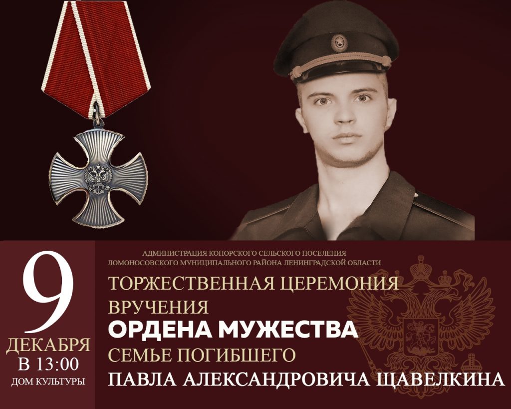 9 декабря состоится торжественная церемония вручения ордена Мужества семье военнослужащего Павла Александровича Щавелкина Опубликовано 03.12.2025 в рубрике Афиша, Мероприятия, Новости 9 декабря в Копорском Центре культуры состоится торжественная церемония вручения ордена Мужества семье военнослужащего Павла Александровича Щавелкина, погибшего при исполнении воинского долга в ходе специальной военной операции.