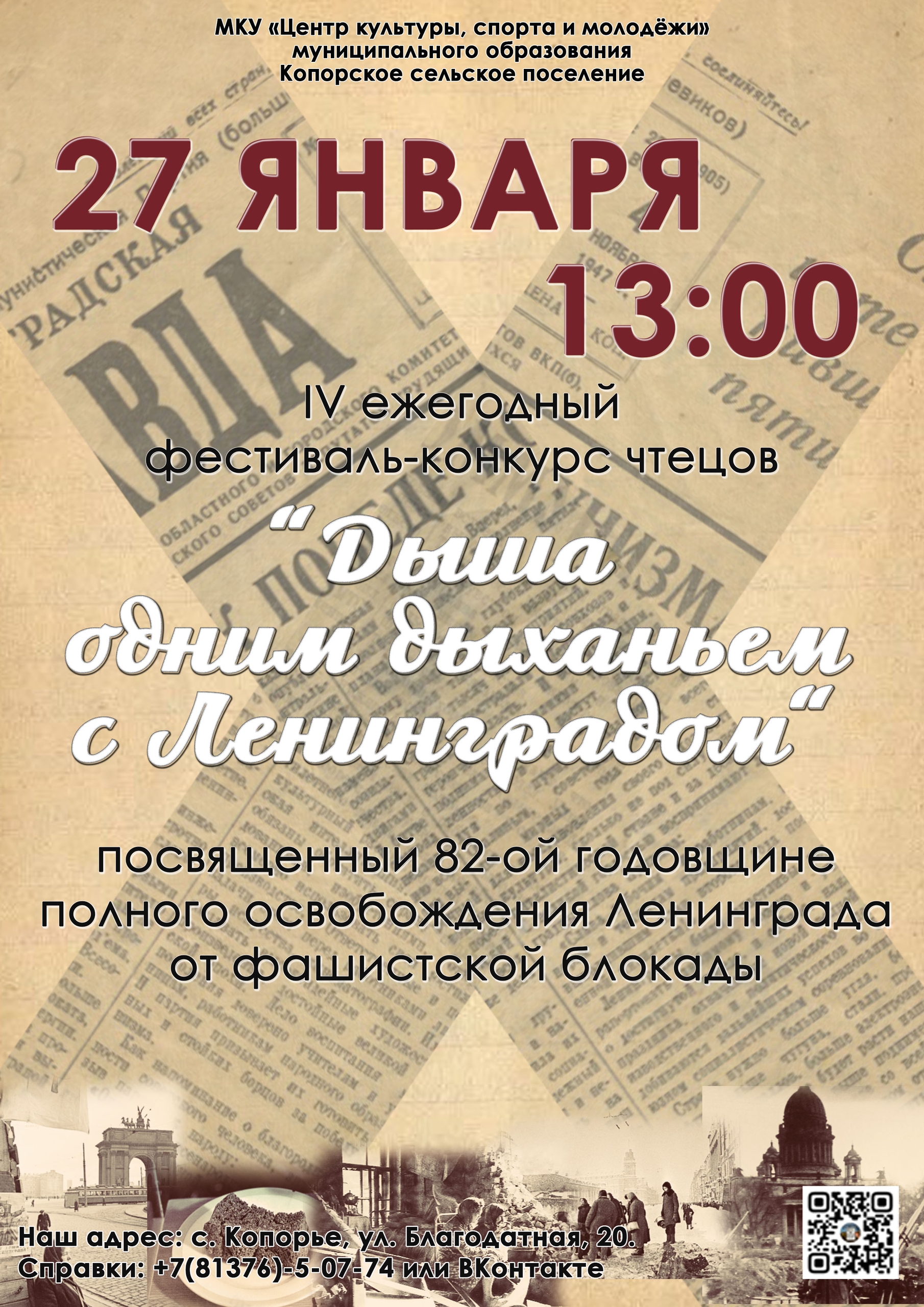 Приглашаем вас на традиционный фестиваль-конкурс чтецов, посвящённом памятному событию – 82-й годовщине полного освобождения Ленинграда от фашистской блокады. Этот конкурс даёт уникальную возможность каждому почувствовать связь поколений, выразить своё уважение и благодарность героям Великой Отечественной войны.