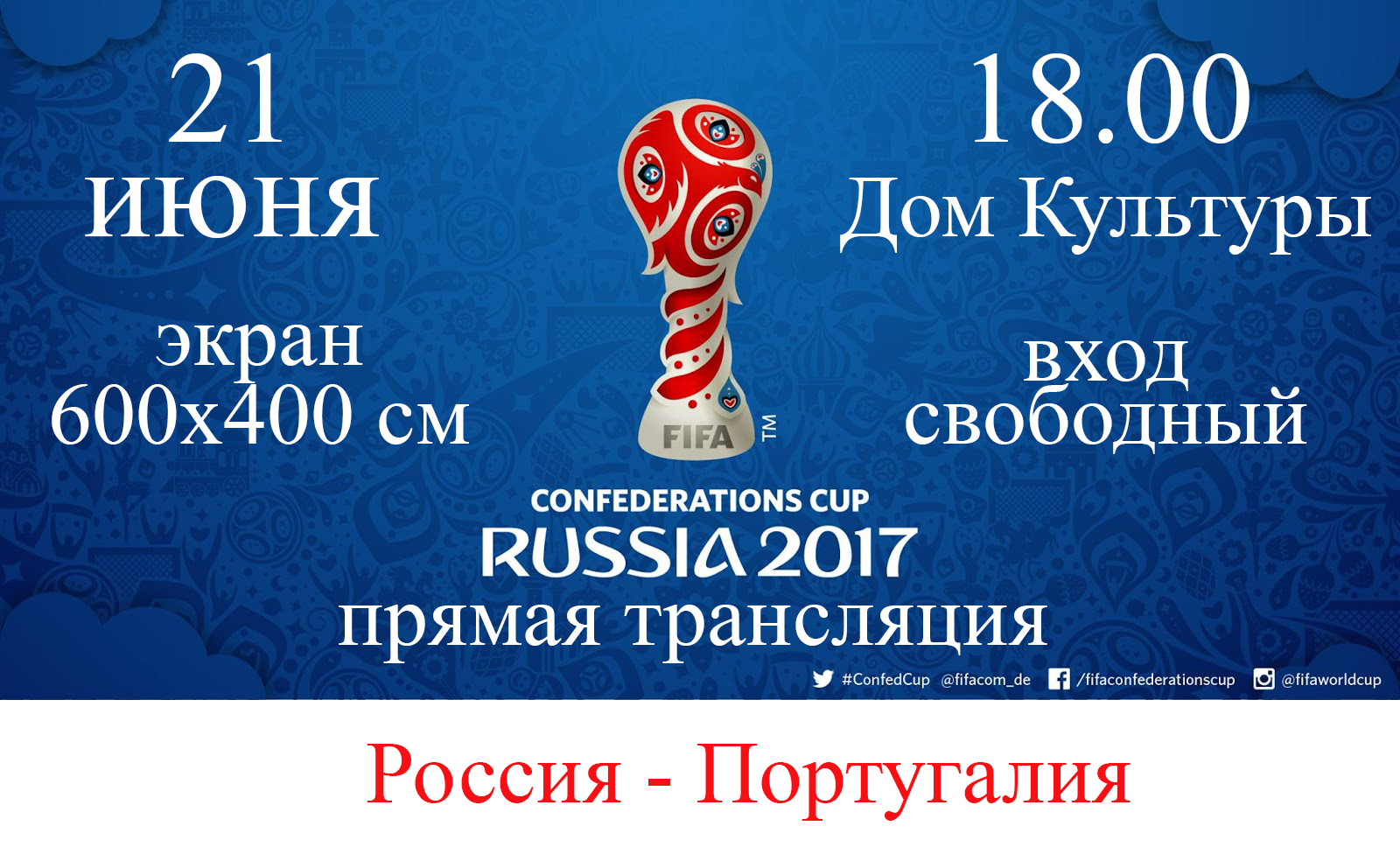 21 июня Дом Культуры покажет прямую трансляцию матча Кубка конфедераций FIFA 2017 Опубликовано 21.06.2017 в рубрике Афиша, Мероприятия, Новости