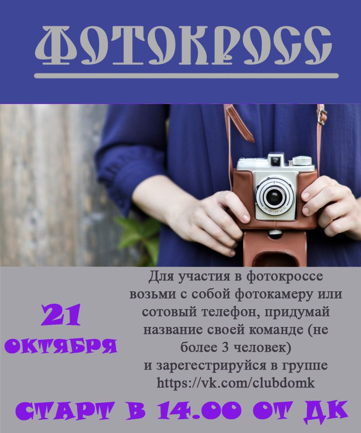 Фотокросс — это не просто фотоконкурс. Мы предлагают всем желающим заняться художественной фотографией со спортивным азартом: нужно сделать несколько снимков на определенные задания за ограниченное время. Самые талантливые и активные участники получат призы на церемонии награждения победителей. Для определения победителей учитываются художественность; оригинальность; скорость; соответствие заданию.