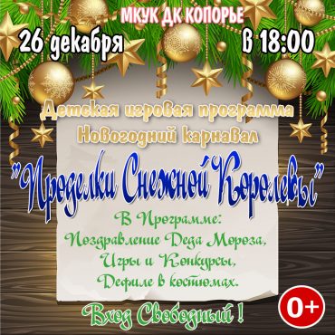 НОВОГОДНИЙ КАРНАВАЛ «ПРОДЕЛКИ СНЕЖНОЙ КОРОЛЕВЫ» Добавить комментарий Опубликовано 24.12.2017 в рубрике Афиша, Мероприятия, Новости
